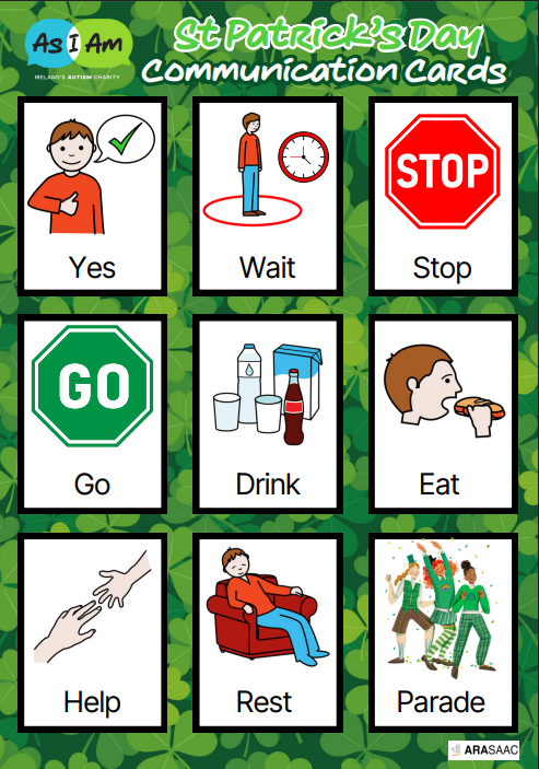Families can also download St Patrick’s Day Communication Cards, which include clear visual prompts such as “Yes”, “Stop”, “Wait”, “Help”, “Rest” and “Parade”. These can help children communicate their needs and preferences during busy events.